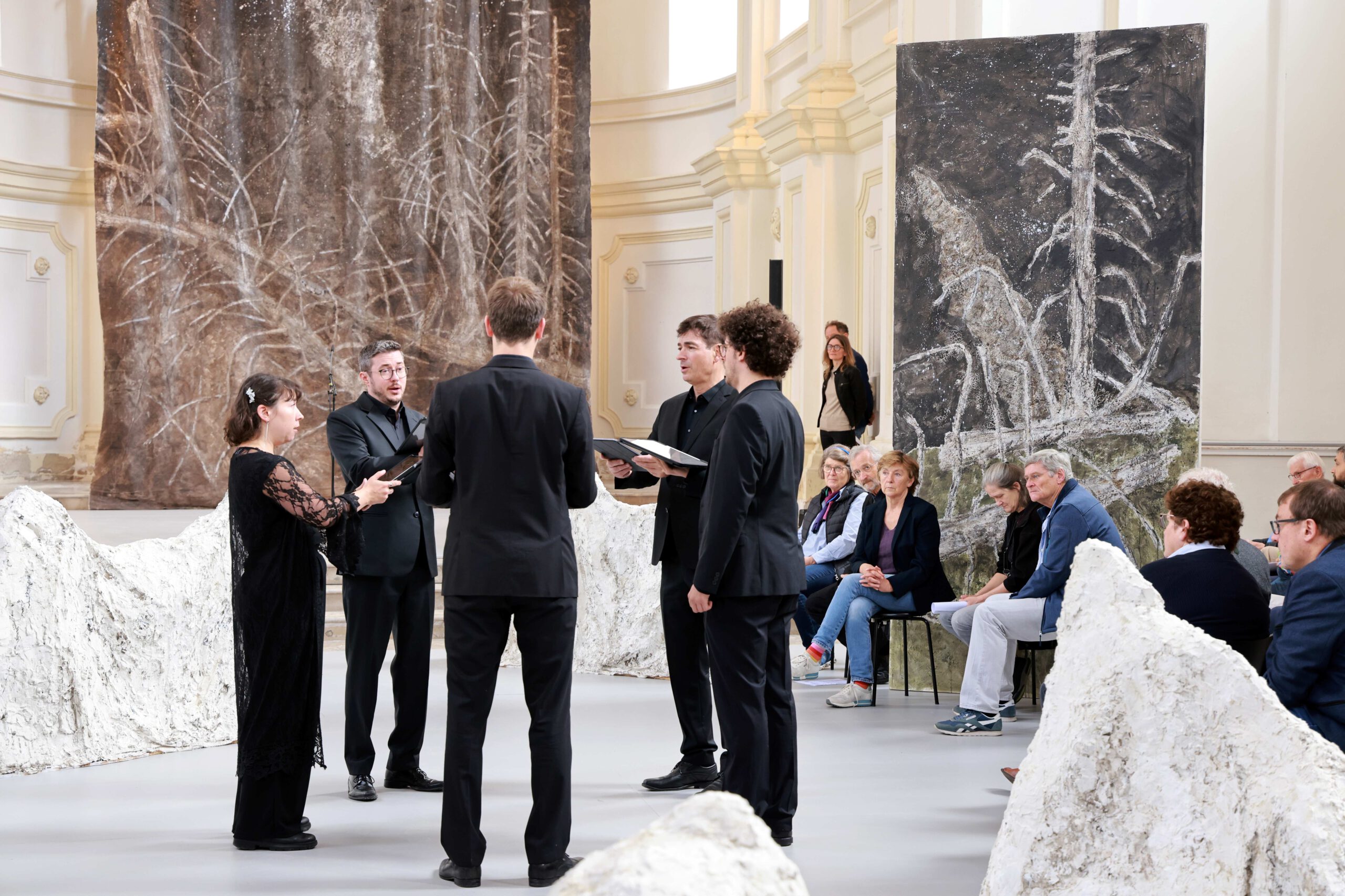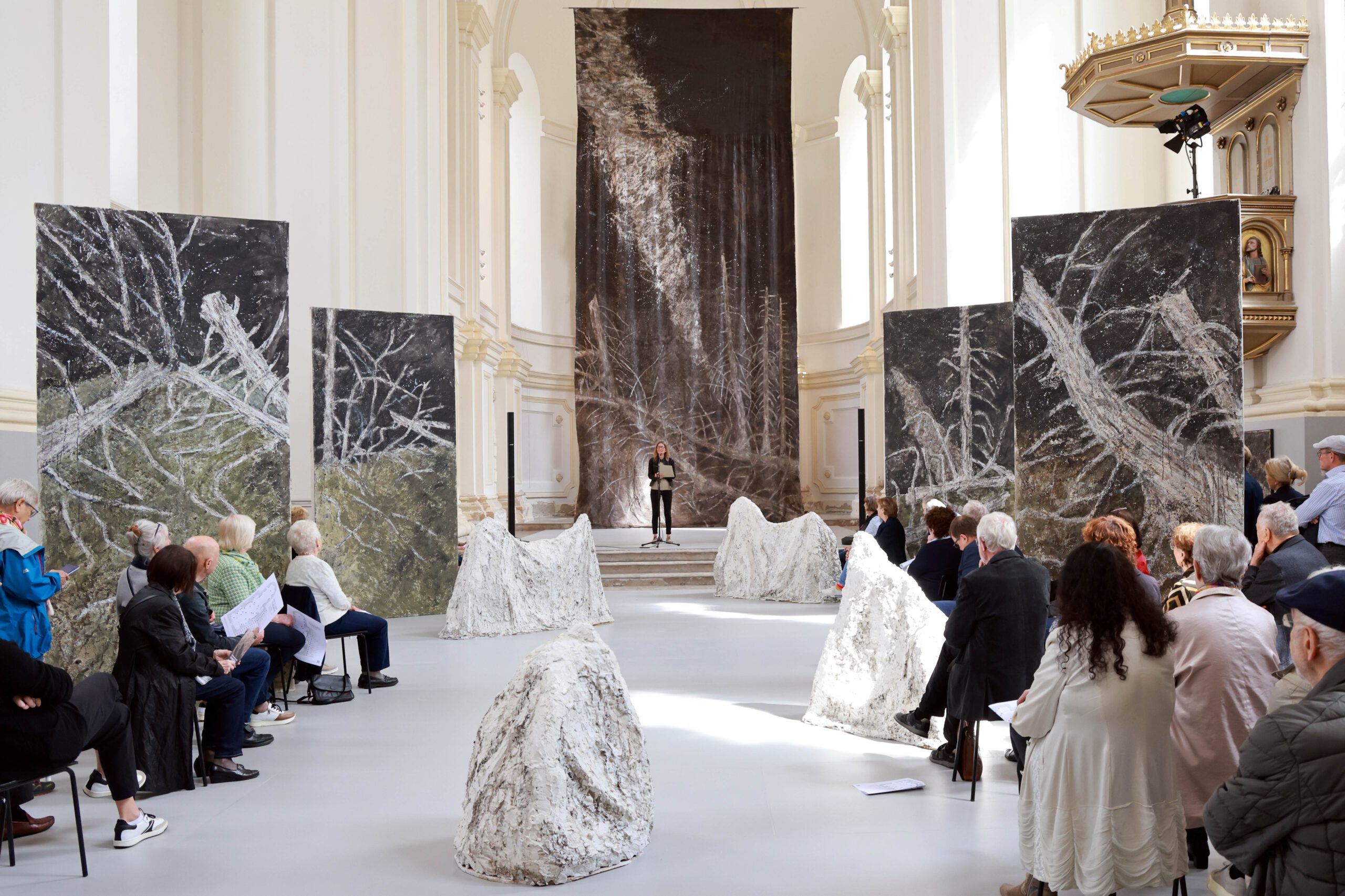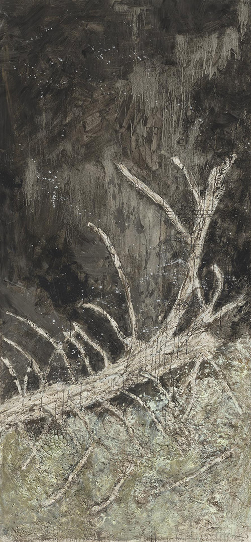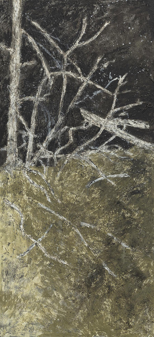 Die im Zentrum platzierte Installation Totholz ist für das Inntaler Klangraumprojekt „Ad lucem-Apo­kalypse“ entstanden, das 2024 mit Martina Gedeck, Wolfgang Mitterer und Singer Pur in der Rosenheimer Nikolauskirche zur Aufführung kam. Das Totholz ist in seiner artifiziellen Schönheit als Symbol von Werden und Vergehen zu verstehen und schlägt somit die Brücke zu den seitlich platzierten Tafelbildern.