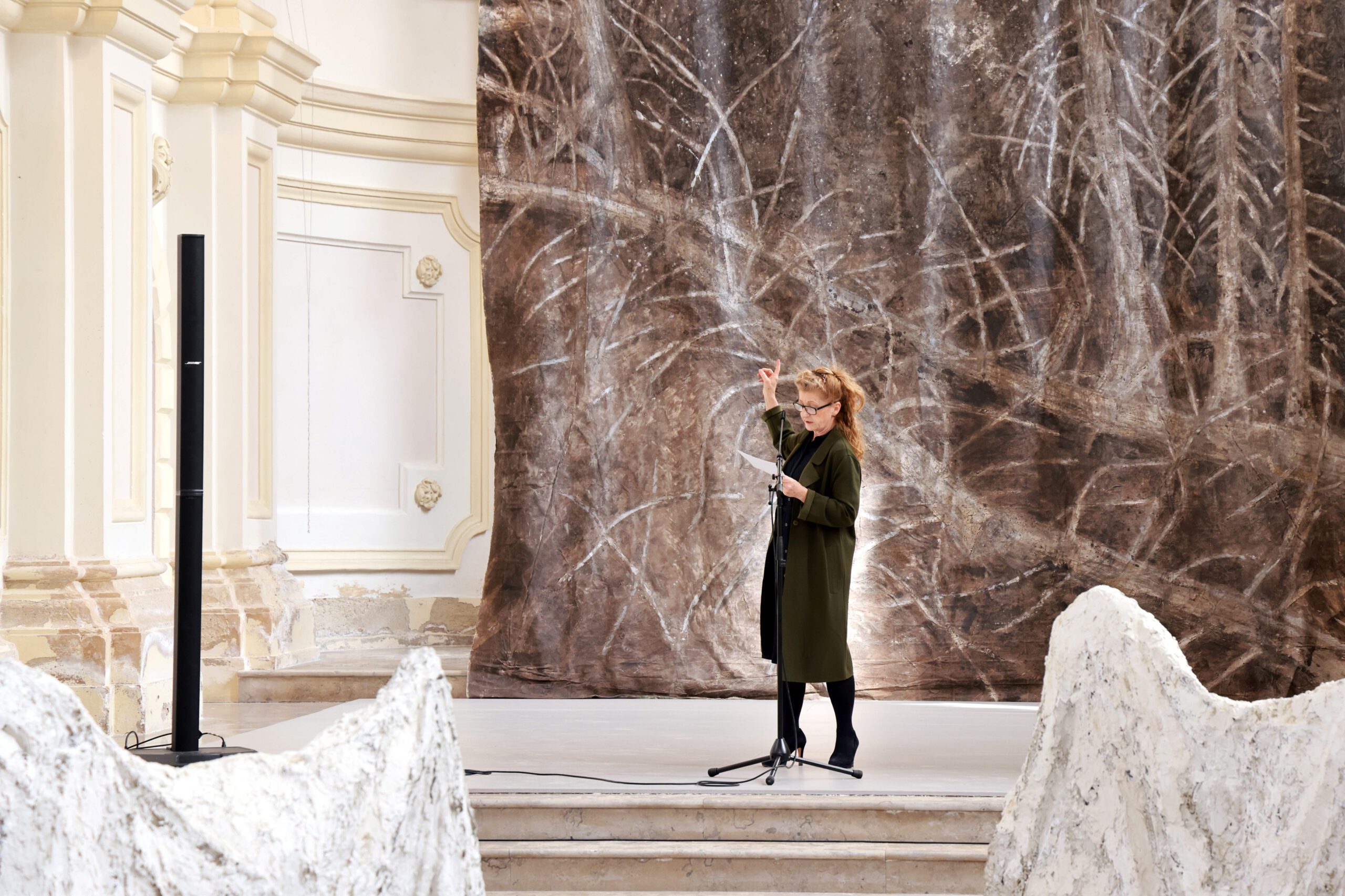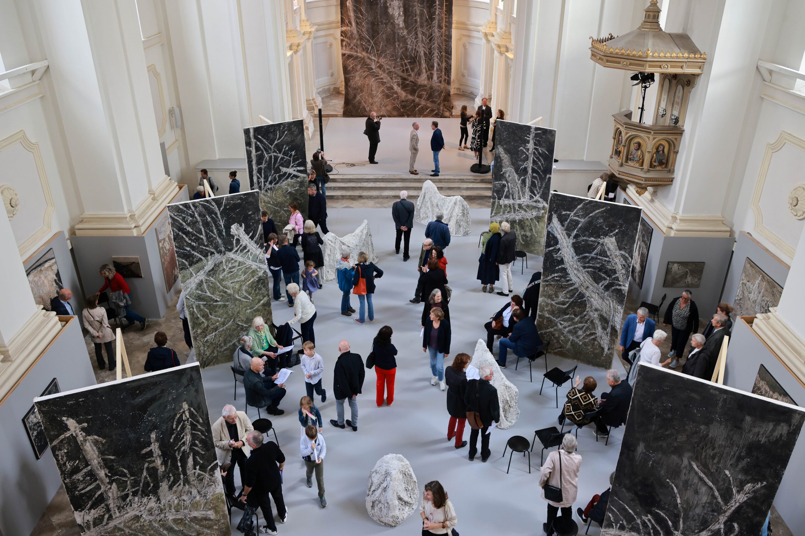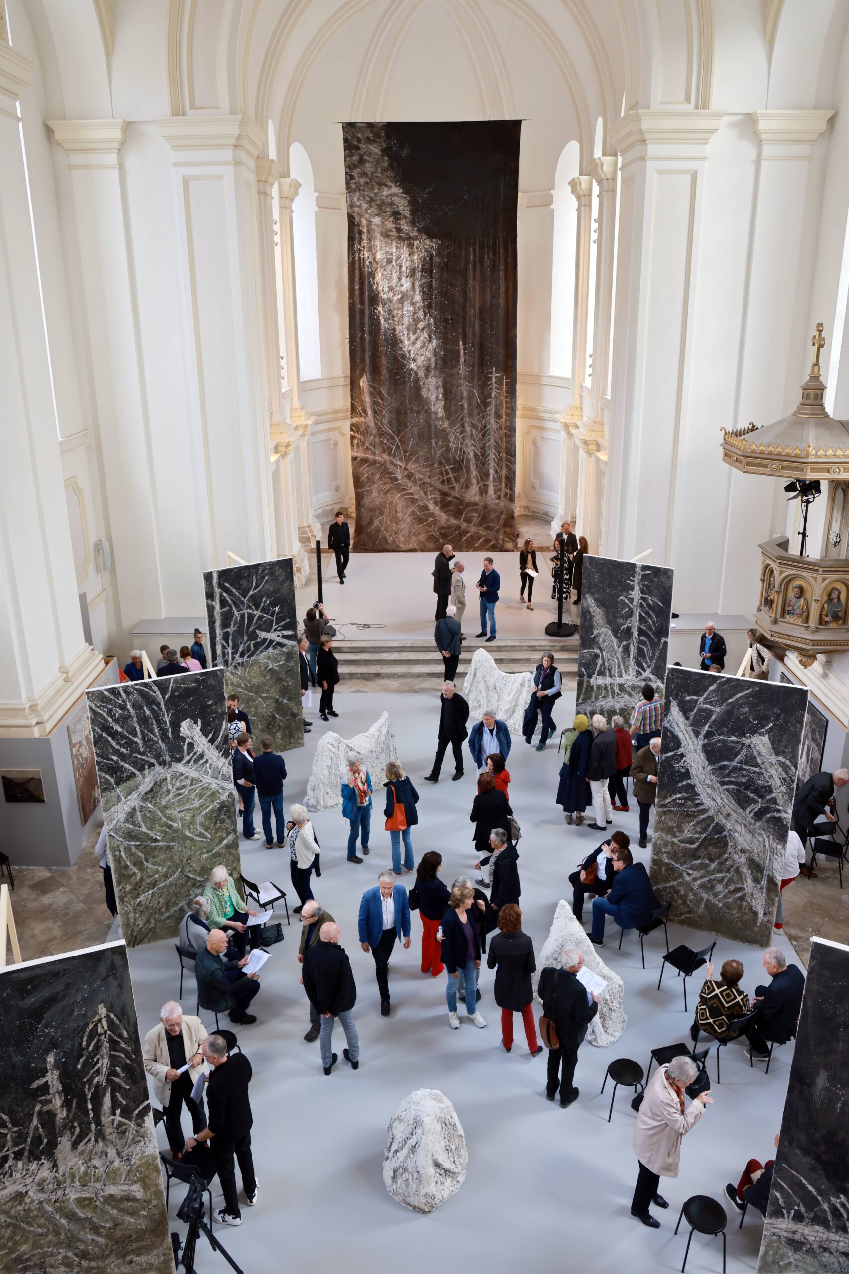Die im Zentrum platzierte Installation Totholz ist für das Inntaler Klangraumprojekt „Ad lucem-Apo­kalypse“ entstanden, das 2024 mit Martina Gedeck, Wolfgang Mitterer und Singer Pur in der Rosenheimer Nikolauskirche zur Aufführung kam. Das Totholz ist in seiner artifiziellen Schönheit als Symbol von Werden und Vergehen zu verstehen und schlägt somit die Brücke zu den seitlich platzierten Tafelbildern.